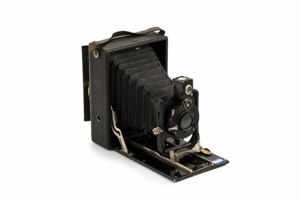 Apparecchio fotografico verticale in legno e metallo di forma parallelepipeda, con maniglia in cuoio.\nUna parete dell'apparecchio è incernierata nel lato inferiore.\nPremendo sul pulsante di sblocco posto superiormente, lo sportello anteriore, in metallo, si apre ed è possibile estrarre il soffietto in tessuto e pelle nera, libero di scorrere su una guida metallica posizionata nell'interno dello sportello stesso.\nLo sportello è mantenuto aperto da due tiranti in metallo.\nIl soffietto termina con un telaio in metallo sul quale è posizionato il porta obiettivo.\nLa lettura della distanza di ripresa può avvenire rispetto ad una scala graduata fissata sull'interno dello sportello che riporta le distanze da 2 a infinito.\nL'obiettivo può scorrere verticalmente lungo due montanti in metallo posti a lato del portaobiettivo.\nAll'interno dell'obiettivo sono inseriti un diaframma iride ed un otturatore centrale.\nSotto all'obiettivo è possibile selezionare, mediante una levetta, l'apertura del diaframma a iride (indicazioni numeriche 11, 12,5, 18, 25, 50).\nSopra all'obiettivo una rotellina permette di selezionare la velocità di scatto dell'otturatore, 1/25, 1/50, 1/100 di secondo più i tempi di posa B e Z (otturatore resta aperto fino a che non si rilasci lo scatto o non si scatti nuovamente).\nLa carica dell'otturatore e lo scatto avvengono mediante una levetta posizionata sempre sull'obiettivo, in prossimità dell'otturatore oppure mediante uno scatto flessibile che andrebbe inserito nell'apposito foro situato vicino alla levetta di scatto (il comando a distanza è mancante).\nSulla lastra porta obiettivo è fissato anche un mirino a riflessione orientabile.\nDalla parte opposta dell'obiettivo è inserito il porta lastra (formato 9x12cm) estraibile. Nel porta lastra è inserito un vetro smerigliato, utilizzato per l'inquadratura e la messa a fuoco, protetto da un paraluce apribile in metallo e tela.\nIl porta lastra può essere sfilato superiormente per caricare la lastra fotografica.\nSotto all'apparecchio e lateralmente sono presenti due fori filettati per il posizionamento eventuale su un cavalletto.