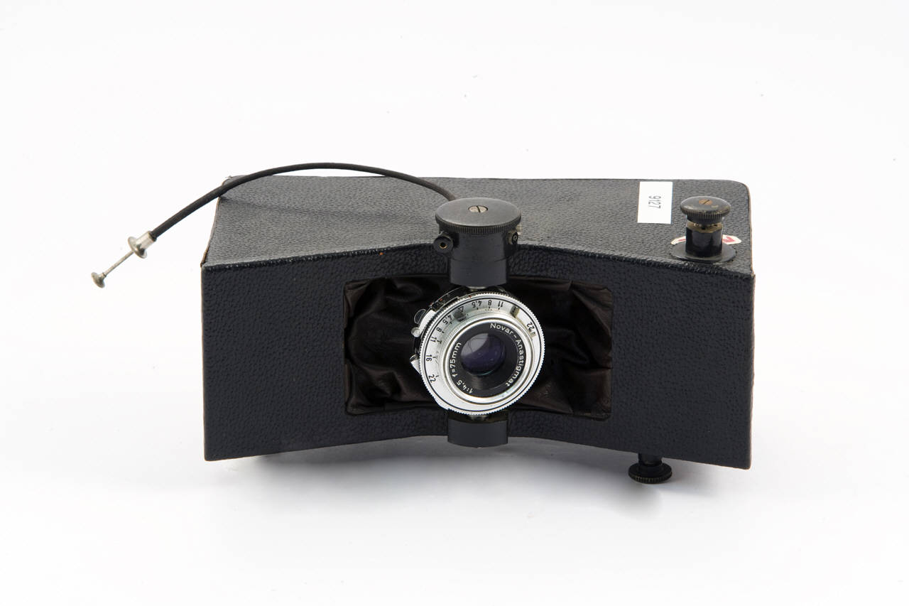 Questo apparecchio fotografico, costruito in metallo e ricoperto in pelle, ha forma parallelepipeda con parete frontale concava.\nNella parete frontale è inserito un obiettivo girevole, a focale variabile, attorno ad un asse verticale. All'estremità superiore di questo asse è inserita una rotella orizzontale per la carica, a molla, della rotazione e un comando pneumatico che aziona la rotazione (scarica della molla di richiamo).\nPer permettere la rotazione dell'obiettivo, la parte di camera oscura che lo collegal resto dell'apparecchio è in pelle marrone.\nAll'interno dell'obiettivo sono presenti un diaframma a iride (aperture da f/4,5 a f/22) e un otturatore centrale (velocità di scatto 1/25, 1/75, 1/200 di secondo) con posizioni regolabili direttamente sull'obiettivo, mediante ghiere e levette.\nSull'obiettivo, in corrispondenza dell'otturatore, è anche presente un foro per l'inserzione di un comando di scatto a distanza (mancante).\nPremendo un pulsante di sblocco posto lateralmente è possibile aprire la cassetta e accedere all'interno dell'apparecchio.\nAll'interno, il porta pellicola in rullo (per formati 6x18cm) veniva alloggiato in un apposto vano posto in un lato e la pellicola si disponeva lungo un telaio curvo in metallo disposto longitudinalmente.\nSulla custodia esterna, superiormente e in corrispondenza del rullo interno, è presente un dispositivo per l'avanzamento e il riavvolgimento della pellicola, inferiormente è inserito un comando di blocco per il dispositivo di rotazione dell'obiettivo.\nSopra alla pellicola si inseriva una protezione nera in materiale plastico di forma semicircolare.\nSulla parete posteriore, opposta all'obiettivo, si trova una finestrella circolare in vetro rosso, coperta da uno sportellino scorrevole in metallo, per la lettura del numero della posa direttamente sul retro della pellicola.