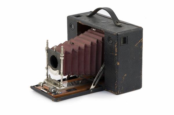 Questo apparecchio fotografico, costruito in legno ricoperto in pelle, ha forma parallelepipeda e maniglia in cuoio per il trasporto.\nSono presenti due mirini a riflessione per pose in verticale e in orizzontale.\nSulla parete frontale, tra le due lenti dei mirini, è inserito uno sportello apribile incernierato nella parte bassa.\nPremendo sul pulsante di sblocco posto superiormente, lo sportello si apre ed è possibile estrarre il soffietto in pelle marrone chiaro, libero di scorrere su una guida metallica posizionata su una tavoletta in legno all'interno dello sportello stesso.\nLo sportello è mantenuto aperto da due tiranti in metallo.\nPer muovere il soffietto occorre tenere premuti due pulsanti di sblocco posti sul telaio e ruotare una rotella posta lateralmente sulla guida.\nLa lettura della distanza di ripresa può avvenire rispetto ad una scala graduata fissata sull'interno dello sportello (indicazioni numeriche 2, 2.5, 3, 4, 5, 8, 15 e infinito).\nIl soffietto termina con un telaio in metallo sul quale è posizionato il porta obiettivo in legno (originariamente ricoperto in pelle).\nL'obiettivo è mancante.\nLa parete posteriore è scorrevole verso l'alto e completamente estraibile.\nAprendo l'apparecchio è visibile l'interno del soffietto e i due vani dove veniva alloggiata, su bobine in legno, la pellicola da 104 (per formati 5x4").\nInferiormente è presente il dispositivo per l'avanzamento della pellicola e il blocco della bobina.\nSotto lo sportello e sotto all'apparecchio sono presenti due fori filettati per il posizionamento eventuale su un cavalletto.