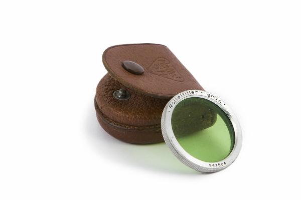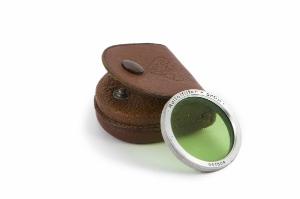 Filtro fotografico di forma circolare con lente verde montata su telaio in metallo.\nInserzione a baionetta davanti all'obiettivo\nIl filtro è conservato in una custodia in cuoio marrone con chiusura a bottone.