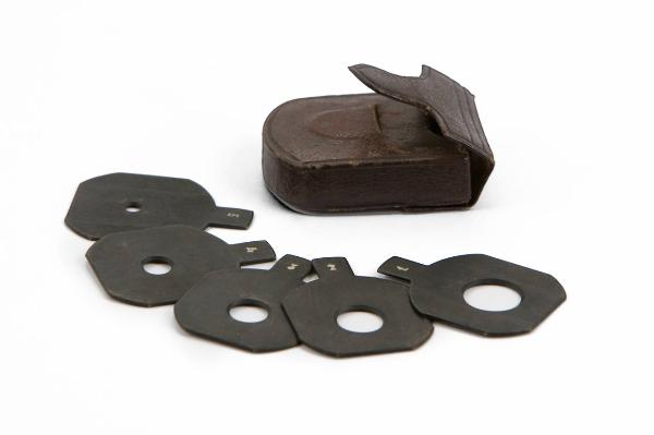 Questo set di diaframmi è costituito da cinque piccole lamine metalliche di forma all'incirca rettangolare con una parte sporgente per consentirne l'impugnatura. Al centro le lamine presentano dei fori di diversi diametri e numerati da 1 a 5 (da 1,2 a 0,3 cm circa).\nI diaframmi sono conservati in una custodia in pelle marrone.
