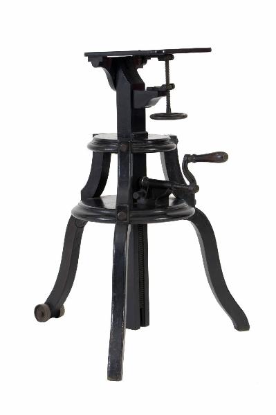 Cavalletto a due piani e una colonna. \nNella colonna è inserita la dentiera del meccanismo di vite senza fine per la regolazione dell'altezza dell'apparecchio. L'altezza veniva variata ruotando una manovella.\nUn volantino permetteva la variazione dell'inclinazione del piano di appoggio dell'apparecchio fotografico e il suo spostamento orizzontale..\nUna delle gambe del cavalletto termina con una piccola ruota che facilita lo spostamento della struttura.