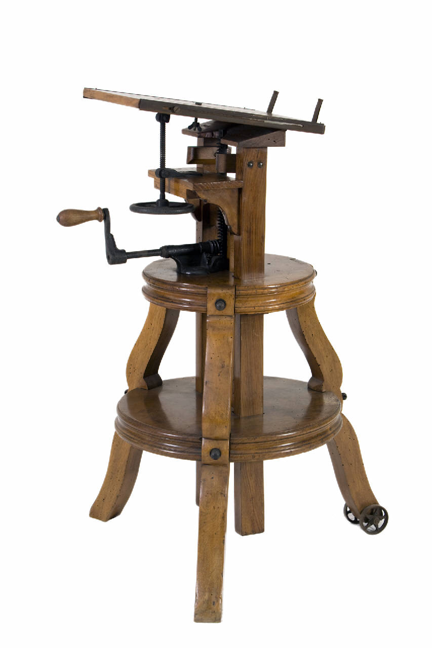 Cavalletto a due piani e tre colonne. \nLe due colonne laterali servono da registro mentre quella centrale monta la dentiera del meccanismo di vite senza fine per la regolazione dell'altezza dell'apparecchio. L'altezza veniva variata ruotando una manovella.\nUn volantino permetteva la variazione dell'inclinazione del piano di appoggio dell'apparecchio fotografico e il suo spostamento orizzontale..\nUna delle gambe del cavalletto termina con una piccola ruota che facilita lo spostamento della struttura.