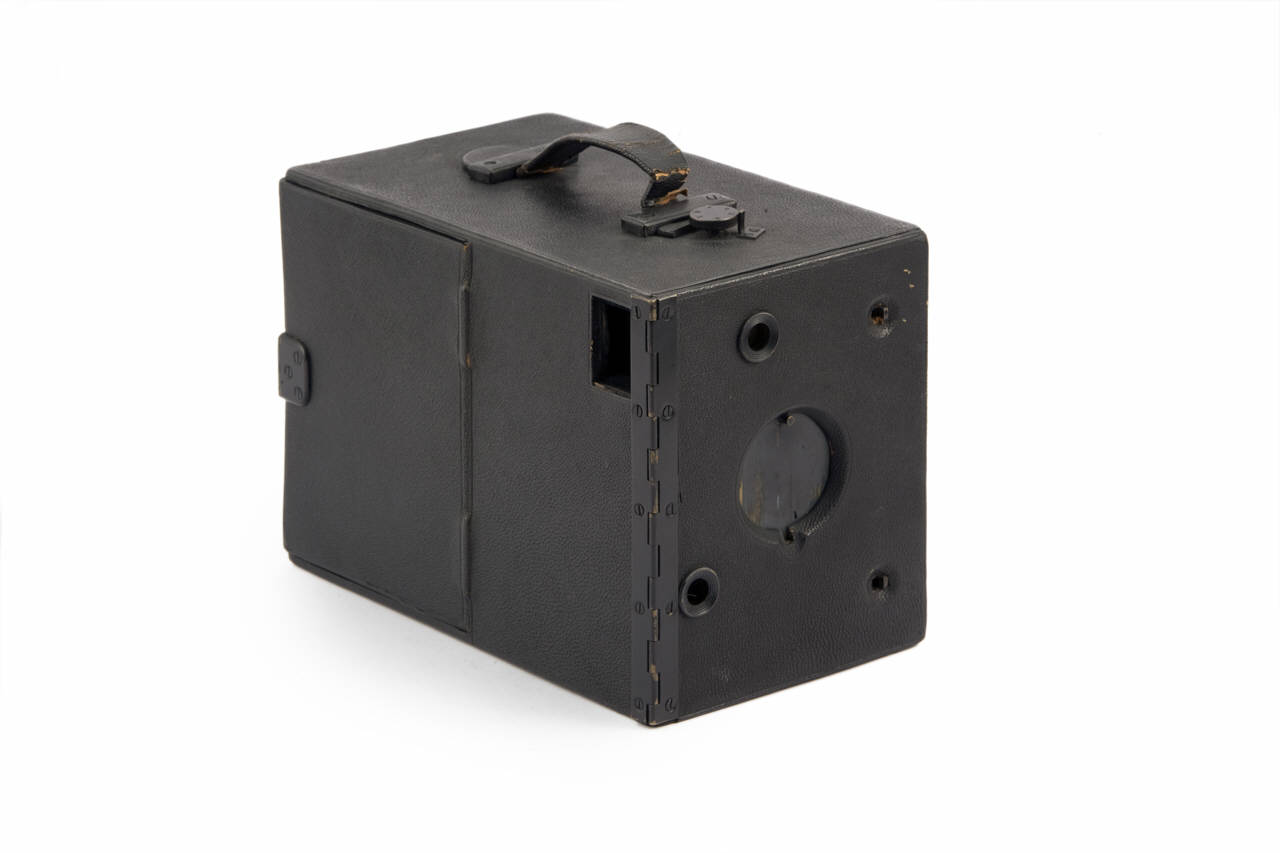 Questo apparecchio fotografico, costruito in legno, ha forma parallelepipeda e maniglia in pelle per il trasporto.\nL'apparecchio è custodito in un bauletto in legno rivestito in pelle esternamente e in velluto internamente, con proteggi spigoli e maniglia in metallo. Nel bauletto è anche custodita una scatola con coperchio contenente cinque porta lastre in metallo, formato 9x12cm. Nel coperchio del bauletto è presente un doppio fondo in cui è attualmente custodito un portalastre.\nSono presenti due mirini a riflessione per pose in verticale e in orizzontale custoditi all'interno dello sportello frontale dell'apparecchio e rivestiti in velluto.\nAprendo questo sportello è visibile interamente l'obiettivo, a fuoco fisso, inserito all'interno della cassetta e coperto da uno sportello scorrevole in metallo..\nSulla superficie laterale dell'obiettivo è presente una fessura per l'inserzione di diaframmi mobili di tipo Waterhouse (uno è inserito).\nSopra all'obiettivo è visibile una chiavetta che comanda la carica a molla dell'otturatore, costituito da una lastrina girevole in metallo.\nSulla parete inferiore si trova il dispositivo per lo scatto dell'otturatore e su quella superiore una rotella permette di selezionare il portalastra da inserire.\nLateralmente una parte della parete della cassetta è apribile: all'interno troviamo una sacca in pelle per l'immagazzinaggio delle lastre e, sullo sportello, un contapose manuale (da 1 a 6).