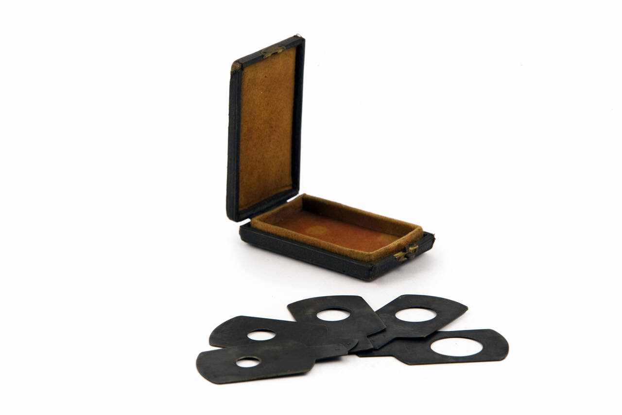 Questo set di diaframmi è costituito da cinque piccole lamine metalliche di forma all'incirca rettangolare con una parte sporgente per consentirne l'impugnatura.\nAl centro le lamine presentano dei fori di diversi diametri e numerati da 1 a 5 (da 1 a 2,3 cm circa).\nI diaframmi sono conservati in una custodia rigida ricoperta in pelle marrone.