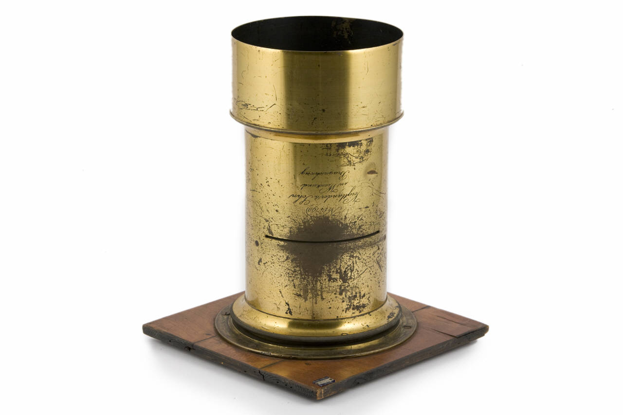 Questo obiettivo di grosse dimensioni è montato su una base in legno di forma quadrata che serviva per il posizionamento sul porta obiettivo di un apparecchio fotografico.\nL'obiettivo è fissato alla tavoletta in legno grazie ad una flangia circolare in metallo.\nL'obiettivo è costituito da un cilindro in metallo nel quale sono inserite due combinazioni di lenti alle due estremità. Tra le due lenti è inserito un diaframma a foro circolare fisso.\nAd un'estremità il cilindro è dotato di paraluce in metallo.\nTra la lente anteriore e il diaframma fisso è possibile inserire, attraverso una fenditura trasversale, un diaframma mobile.