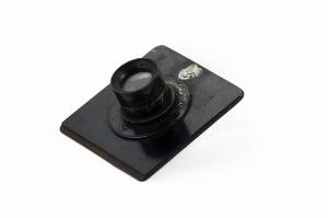 Questo obiettivo è montato su una base in bachelite di forma quadrata che serviva per il posizionamento sul porta obiettivo di un apparecchio fotografico.\nL'obiettivo è fissato alla tavoletta grazie ad una flangia circolare in metallo.\nL'obiettivo è costituito da un cilindro in metallo al cui interno sono inserite due combinazioni di lenti di piccolo diametro posizionate specularmente. Ciascun elemento è costituito da un doppietto di lenti incollate una negativa e l'altra positiva, con quelle positive che restano verso il centro. Le lenti positive hanno indice di rifrazione più basso rispetto a quelle negative esterne.