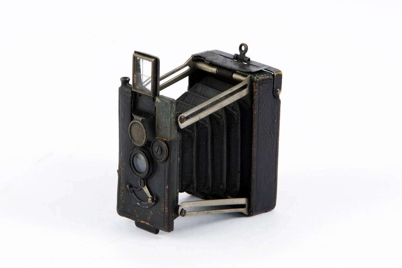 Apparecchio fotografico verticale in metallo ricoperto in pelle, di forma parallelepipeda e piccole dimensioni.\nIl soffietto, in pelle nera, è ripiegato all'interno della macchina e può essere estratto tirando verso l'esterno la parte centrale della parete frontale.\nUna volta estratto, il soffietto è sorretto e mantenuto in posizione da due coppie di leve metalliche (tiranti).\nDavanti al soffietto, sulla parete frontale, è inserito l'obiettivo.\nLa parte superiore del telaio porta obiettivo è scorrevole. Tirando verso l'alto si estrae una lente convergente con mirino inciso inserita in una cornice in metallo.\nQuesta lente, accoppiata ad un piccolo anello in metallo posizionato sul dorso dell'apparecchio, costituisce il mirino Newtoniano dell'apparecchio.\nFacendo scorrere la lente verso l'alto, si sposta anche il coperchio posto davanti all'obiettivo, costituito da un dischetto in metallo.\nL'obiettivo è a fuoco fisso e con due diaframmi costituiti da una lamina metallica sulla quale sono praticati due fori di diverso diametro. Il posizionamento del diaframma desiderato avviene ruotando un'apposita levetta posizionata sotto all'obiettivo.\nDietro al diaframma è inserito un otturatore costituito da una piccola lamina metallica rotante, con velocità di scatto da 1/100 a 1/25 di secondo, più le pose B e T.\nLa carica dell'otturatore avviene attraverso una rotella posta superiormente, sul dorso dell'apparecchio, in corrispondenza dell'otturatore.\nLo scatto manuale è inserito lateralmente nel porta obiettivo. Superiormente, di fianco al mirino, è inserito il dispositivo per il collegamento di uno scatto a distanza (non presente).\nDalla parte opposta dell'obiettivo dovrebbe essere inserito il porta lastra estraibile (formato 4x5cm), ora mancante.\nDal retro è visibile la camera oscura. \nLa carica dell'otturatore avviene attraverso una rotella posta superiormente, sul dorso dell'apparecchio, in corrispondenza dell'otturatore.\nInferiormente è presente un foro filettato per il fissaggio su cavalletto.