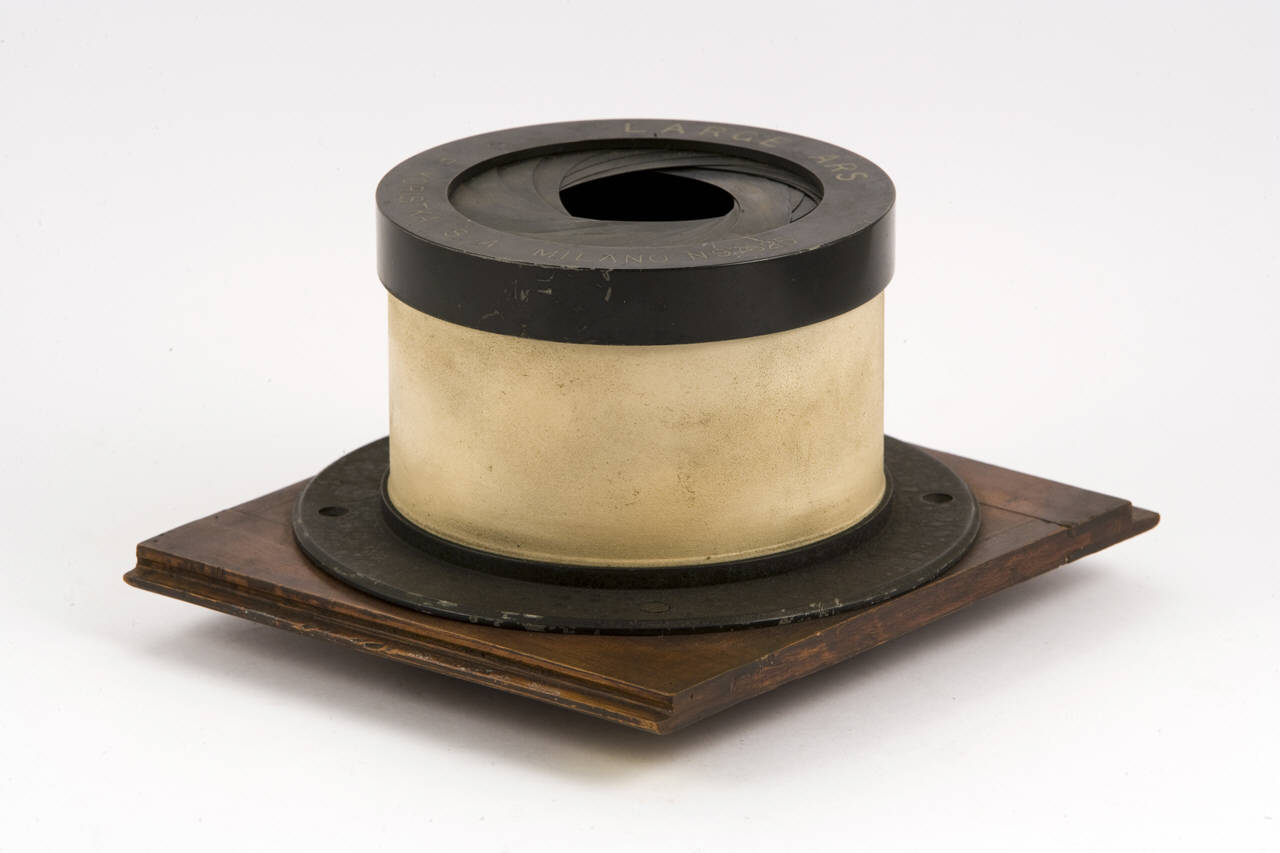 Questo obiettivo di grosse dimensioni è montato su una base in legno di forma rettangolare che serviva per il posizionamento sul porta obiettivo di un apparecchio fotografico.\nL'obiettivo è fissato alla tavoletta in legno grazie ad una flangia circolare in metallo.\nE' costituito da un cilindro in metallo alle cui estremità sono inseriti, da una parte, una lente a menisco e dall'altra un diaframma a iride.\nLa regolazione dell'apertura delle lamelle metalliche che lo costituiscono è ottenuta spostando una levetta posta sulla superficie laterale del cilindro, in corrispondenza del diaframma stesso.\nIn corrispondenza della lavetta sono indicate le posizioni 20, 40, 60, 80, 90.