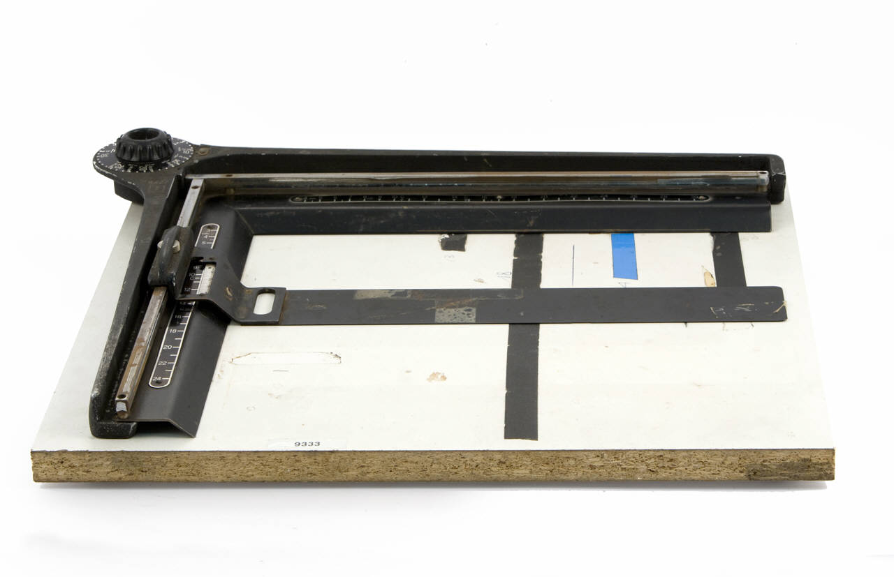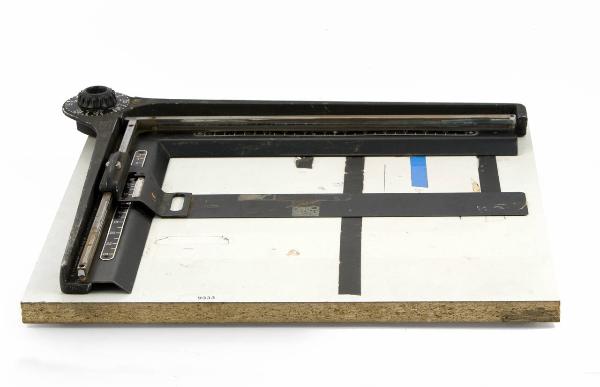 Su una base in legno impiallicciato con rivestimento in materiale plastico è fissata una struttura ad elle in metallo sulla quale sono incernierati e sollevabili due righelli: uno con indicazioni numeriche da 3 a 24cm, l'altro da 4 a 30cm. Solidali ai righelli sono fissate due aste in metallo a sezione quadrata. Lungo quella verticale può scorrere una aletta costituita da una lamina metallica con nonio da 4 a 40mm per l'individuazione esatta delle dimensioni desiderate (dimensione orizzontale). Sul piano sono incollate delle strisce adesive in verticale, in corrispondenza dei valori 13cm, 18, cm, 24cm (è mancante l'aletta verticale).\nSull'angolo della elle in metallo è collocata una rotella in bachelite con un foro al centro. Muovendo la rotella dal retro fuoriesce una linguetta in metallo. Sulla ruota si hanno le indicazioni numeriche da 10 a 25 intervallate con valori da 3/8 a 1 in. e da 4 a 30 intervallate da valori da 1/4 a 1 1/4 in.