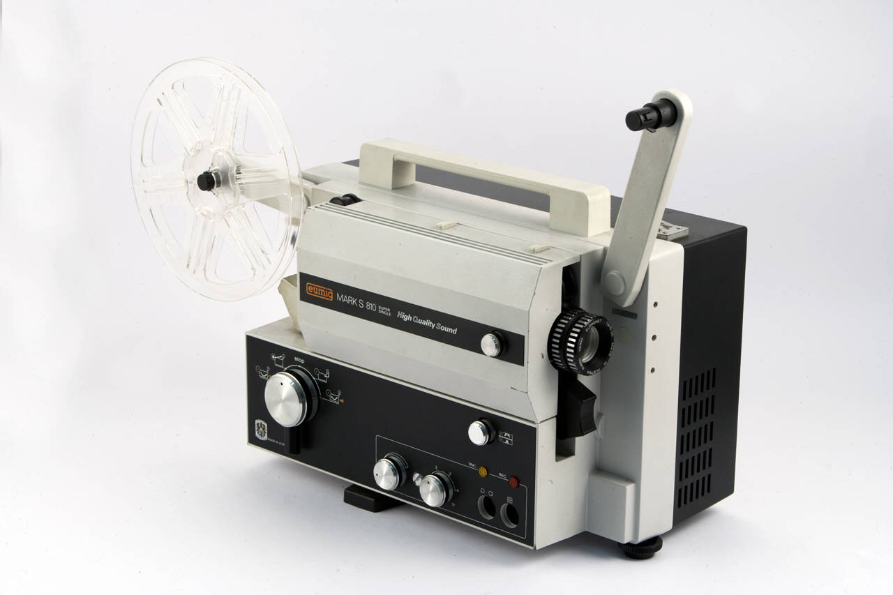 Cineproiettore in metallo da tavolo con maniglia, poggiante su piedini di cui quello frontale ad altezza regolabile.\nIl corpo centrale racchiude il motore elettrico, il dispositivo illuminante, l'altoparlante.\nSulla base, lateralmente, sono inseriti diversi dispositivi d'uso e regolazione. Un commutatore che funge da interruttore centrale per il funzionamento del proiettore: inserimento pellicola, proiezione, avviamento, riavvolgimento rapido, stop; i comandi per il sonoro: volume, dissolvenza, due prese a cinque poli per microfono e registratore esterno; una rotella per regolare la posizione delle linea di divisione tra i fotogrammi.\nSu una parete laterale è inserito l'obiettivo Eumig Vario-Eupronet 1:1,3 f=15-30mm, con messa a fuoco mediante un'apposita rotella collocata lateralmente e zoom ruotando l'apposita ghiera sull'obiettivo (da 15 a 30mm). Sulla stessa parete laterale troviamo un commutatore a leva per slezionare la velocità della pellicola a18 o 24 fotogrammi al secondo.\nAi lati della scatola contenente obiettivo e apparato illuminante, si hanno due bracci portabobine che possono essere alzati per il corretto posizionamento durante l'uso. I bracci terminano con due perni rotanti per l'inserimento delle bobine. E' presente una bobina unificata per pellicole formato 8 e Super 8 in plastica con custodia in plastica e scatola in cartone. Sopra all'obiettivo è inserita la fessura per l'ingresso della pellicola nel proiettore, sotto alla bobina posteriore è inserita la fessura di uscita.\nSvitando l'apposita vite di blocco, posta tra i comandi del sonoro, si può levare il coperchio della scatola laterale per accedere alla lampada ed effettuare la manutenzione. Sono inoltre visibili le guide interne che regolano il percorso della pellicola all'interno del proiettore.\nLa parete posteriore è parzialmente forata, dove è inserito l'altoparlante. Sotto ad essa si trova la presa per il collegamento ad un altoparlante esterno. Più in alto troviamo una presa per il cavo di collegamento alla rete elettrica. E' presente il cavo di alimentazione con spina schuko.\nE' inoltre presente un microfono in plastica e metallo con spina di collegamento a cinque poli.