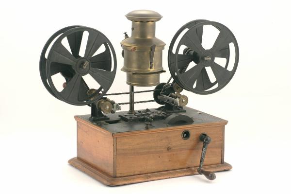 Proiettore cinematografico da tavolo. Sopra una scatola in legno sono fissate due bobine porta pellicole da 35mm, una per la pellicola da proiettare l'altra per avvolgere la pellicola già proiettata, e in mezzo ad esse l'apparato illuminante. Questo è disposto in verticale ed è costituito da un cilindro in ottone con camino, che conteneva la lampada ad alimentazione elettrica (ora mancante) e che termina, nella parte inferiore con una lente condensatrice. L'apparato illuminante è libero di scorrere lungo un'asta verticale così da permettere la variazione dell'intensità di luce. In corrispondenza del fascio illuminante che fuoriesce verso il basso, sul piano superiore della base in metallo, in orizzontale, è inserita una guida nella quale passa la pellicola mentre scorre da una bobina all'altra trascinata dai due cilindri con dentini sporgenti sui lati che si incastrano nei fori della pellicola stessa. Il meccanismo di trascinamento della pellicola e gli altri dispositivi di trasmissione del moto alle bobine sono azionati mediante una manovella posta sulla prima bobina. Le due aste porta bobine sono collegate mediante catene, ruote dentate e una lunga molla per la trasmissione del moto.\nDentro alla scatola, un prisma a riflessione totale devia il fascio verso l'obiettivo da proiezione. Mediante una rotella posta all'esterno della scatola è possibile la messa fuoco.\nLateralmente, sulla base si trovano due boccole per i collegamenti elettrici. Dall'altra parte una manovella, collegata con un volano, permette la rotazione dell'otturatore interno costituito da un disco in metallo con fessure di diverse dimensioni.