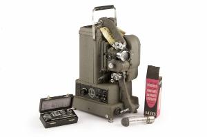 Proiettore cinematografico in metallo, di forma vagamente parallellepipeda poggiante su piedini ad altezza regolabile con maniglia per il trasporto.\nE' costituito sostanzialmente da una base nella quale sono inseriti parte del motore e le parti elettriche con i relativi comandi all'esterno, una parte superiore divisa in apparato illuminante e dispositivo di proiezione.\nIl motore funziona con una tensione di alimentazione di 110V collegato alla sorgente di alimentazione mediante un'apposita presa inserita nella base. Sopra la presa un interruttore permette di selezionare la potenza della lampada utilizzata, 250 o 500W, con relativo indicatore visivo su scala lineare. Sempre sulla base sono inseriti un interruttore per l'accensione/spegnimento, uno per l'avanzamento della pellicola, e un potenziometro per variare l'intensità della corrente in entrata.\nL'apparato illuminante è racchiuso in un parallelepipedo a sviluppo verticale ed è costituito da una lampada da 500W inserita tra uno specchio concavo e una lente condensatrice. Sulla parte alta della lampada è appoggiato un coperchio a semisfera in alluminio. Accanto alla lampada è inserito un reostato a filo con comando esterno per la regolazione dell'intensità della luce. Questa parte è chiusa da un coperchio in metallo con fessure per l'aerazione e il raffreddamento.\nDavanti alla lente condensatrice si trova il dispositivo di proiezione. Questo è costituito da un obiettivo con messa a fuoco regolabile mediante un'apposita rotella posta accanto, due bracci sui quali si inseriscono le bobine contenenti la pellicola da 16mm, una per la pellicola da proiettare e l'altra che raccoglie quella già proiettata, vari cilindri dentati e non che permettono il corretto avanzamento e posizionamento della pellicola, alcune leve di comando per la velocità di riproduzione (12-24 fotogrammi al secondo), per la visione diretta o all'indietro e per il riavvolgimento veloce. Tra lente condensatrice e obiettivo una fessura permette l'inserimento di un telaietto rettangolare che costituisce la guida per lo scorrimento della pellicola. Questo telaietto presenta una riquadro rettangolare in corrispondenza del punto in cui si posiziona il fotogramma che viene proiettato.\nIl motore contenuto nella base è collegato a questi cilindri dentati che permettono l'avanzamento della pellicola mediante dispositivi custoditi accanto all'obiettivo e alle aste delle bobine.\nCome accessori sono presenti una piccola trousse in legno ricoperta in pelle con interno imbottito contenente dei ricambi quali due ruote dentate, una guida con due rocchetti, un telaietto con fessura per fotogramma e una lampada da proiezione di ricambio da 500W.