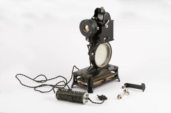 Proiettore cinematografico in metallo, a sviluppo verticale. E' costituito sostanzialmente da una base con quattro piedini, un reostato, l'apparato illuminante, il dispositivo di proiezione.\nAlla base si ha una presa per il collegamento del reostato esterno costituito da un cilindro in ferro forato, contenente un nucleo isolante attorno al quale è avvolto il filo conduttore, un cursore lineare permette di selezionare la tensione di alimentazione da 10 a 140V. Dal reostato fuoriescono due cavi per il collegamento al proiettore e alla rete.\nAlla base è fissata una struttura verticale in metallo al centro della quale si trova il dispositivo di proiezione costituito da una lente, un otturatore rotante, una manovella per l'avanzamento manuale. Nella parte alta si ha il vano porta pellicola da 9,5mm da proiettare. Sul telaio, sotto all'apparato illuminante, è presente un vano circolare, chiuso da un vetro, nel quale si raccoglieva la pellicola proiettata.\nDietro alla lente del dispositivo di proiezione, si inserisce l'apparato illuminante costituito da una lampadina a filamento, uno specchio concavo e una lente condensatrice collocati in posizione opposta rispetto alla lampada, inseriti in un contenitore cilindrico collegato elettricamente alla base. Questo cilindro è vincolato nella parte bassa ma apribile a compasso per permettere il posizionamento di un telaietto rettangolare, tra condensatore e lente di proiezione, che costituisce la guida per lo scorrimento della pellicola 9,5mm, forata al centro. Questo telaietto presenta una riquadro rettangolare in corrispondenza del punto in cui si posiziona il fotogramma che viene proiettato.\nIl proiettore è contenuto in una custodia rigida in legno ricoperta in pelle marrone, con maniglia in cuoio per il trasporto e ganci di chiusura. Tutta la parete frontale è apribile.
