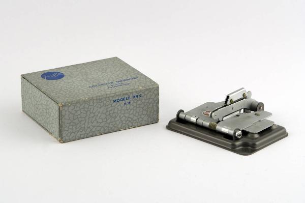 Dispositivo in metallo costituita da una base di forma rettangolare con una placca in metallo fissa che occupa la metà sinistra della base e che termina, verso il centro, con un profilo tagliente. Sulla placca sono presenti dei dentini in metallo (chiodetti di guida) da utilizzare per posizionare correttamente la pellicola da 8mm o 16mm (fori della pellicola nei chiodati corrispondenti).\nSu un lato lungo della base è fissato un perno longitudinale al quale sono vincolate ma libere di ruotare, a sinistra, in corrispondenza della placca fissa, una placca di compressione e a destra un'aletta con la rispettiva placca di compressione.\nDal lato opposto rispetto al perno troviamo il raschiatore ovvero una piccola lamina dentata che può ruotare per essere posizionata in corrispondenza del punto dove la pellicola viene tagliata.