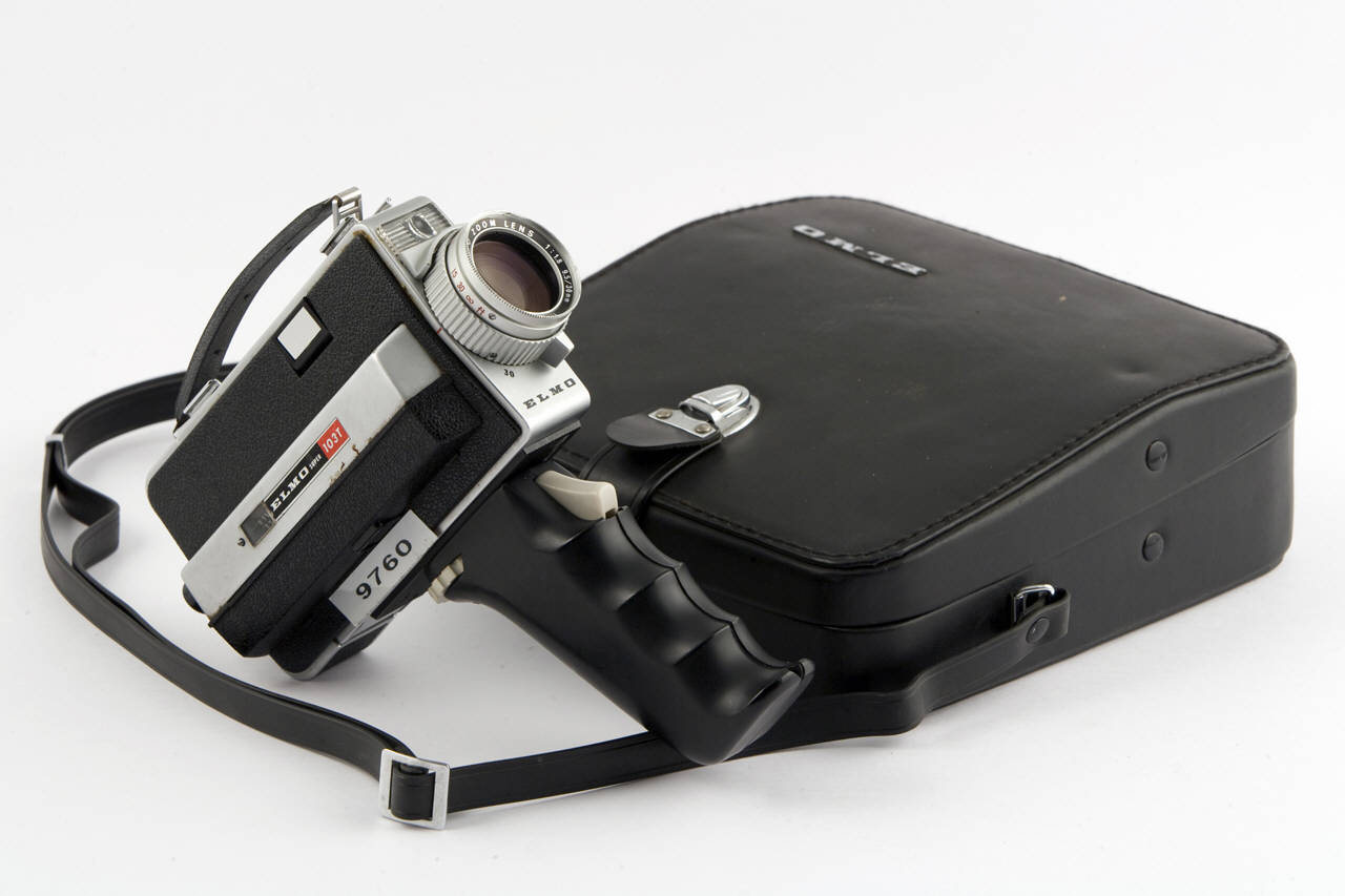 Cinepresa in metallo e plastica di piccole dimensioni, di forma parallelepipeda con bordi arrotondati, con impugnatura ergonomia in plastica nera e maniglia in cuoio. All'impugnatura è collegata una maniglia in plastica. E' presente in una borsa rigida in pelle e velluto con tracolla in plastica e chiusura in metallo.\nAll'interno dell'apparecchio si ha un motore elettrico alimentato con due batterie da 1,5V.\nSul lato destro è inserito un mirino con messa fuoco e, sotto, il vano porta batterie, chiuso da un coperchio in plastica. Sul visore si può applicare un paraluce in gomma e plastica.\nSull'altra parete laterale si ha un contametro.\nSopra, una levetta permette di selezionare diverse tipologie di soggetti: luce del sole, ritratto.\nLa parete posteriore è incernierata nella parte alta ed apribile per l'inserimento della cartuccia contenente la pellicola Super 8. All'interno un ingranaggio sporgente si incastra in un apposito dispositivo rotante nella cartuccia che permette l'avanzamento della pellicola. La cartuccia ha forma quadrata con bordi arrotondati e la pellicola è tutta contenuta all'interno tranne un breve tratto. In corrispondenza del punto dove la pellicola emerge dalla cartuccia, è inserita una guida che permette di farla scorrere dietro all'obiettivo. La velocità della pellicola è di 18 fotogrammi al secondo.\nSulla parete frontale è inserito, al centro, l'obiettivo Elmo Zoom 1:1,8 f=9,5-30mm, in alto un esposimetro. L'obiettivo ha messa a fuoco variabile da 5 a 30 (infinito) ft e zoom per distanze focali da 9,5 a 30 mm. Messa a fuoco e zoom si regolano direttamente sull'obiettivo.\nSotto alla cinepresa, è presente un foro filettato in cui è avvitata l'impugnatura che va collegata ad un apposita presa sulla cinepresa. Davanti all'impugnatura un tasto avvia la ripresa.\nE' inoltre presente una borsa in pelle con serratura e tracolla per il trasporto.