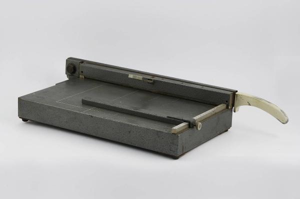Base in metallo rettangolare poggiante su quattro piedini in gomma. Su un lato lungo è fissata una lamina in metallo ripiegata ad U contenente un pressino azionabile con una leva in metallo con impugnatura in materiale plastico. Ad un estremo della lamina è vincolata una lama tagliente di forma arcuata con manico in materiale plastico che si posiziona dietro alla pressa.\nSu un lato corto della base è presente un righello graduato in mm (con indicazioni numeriche da 3 a 23cm) e pollici (da 1 a 9). Sul righello è libera di scorrere un'asta in metallo posizionata perpendicolarmente ad esso.