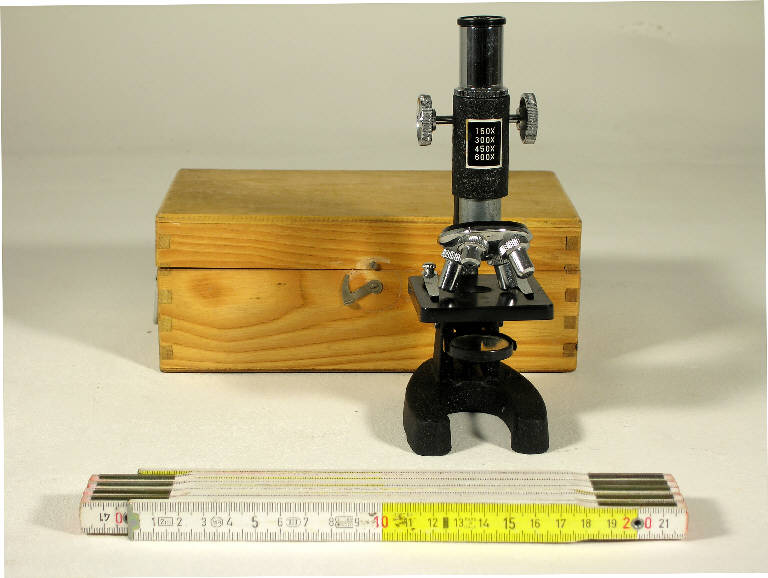 Lo strumento è costituito da uno stativo metallico che sostiene il sistema ottico ed è così formato: una base d'appoggio a ferro di cavallo, un piano portaoggetti con una fenestratura che permette il passaggio della luce dal basso, un braccio ricurvo che sostiene il tubo oculare. Il sistema ottico è costituito da uno specchio (in basso) per riflettere la luce proveniente dalla fonte luminosa, il revolver che ospita quattro obiettivi intercambiabili (tramite rotazione del revolver stesso): 150x, 300x, 450x, 600x , e il tubo oculare la cui altezza, per la messa a fuoco, è regolabile con un comando a doppia manopola.