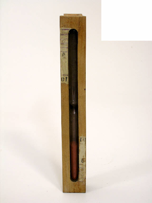 Lo strumento è costituito da una custodia di legno con una ampia finestra, da cui è visibile il corpo della clessidra: due bulbi di vetro collegati attraverso uno stretto foro, al cui interno è collocata sabbia finissima.