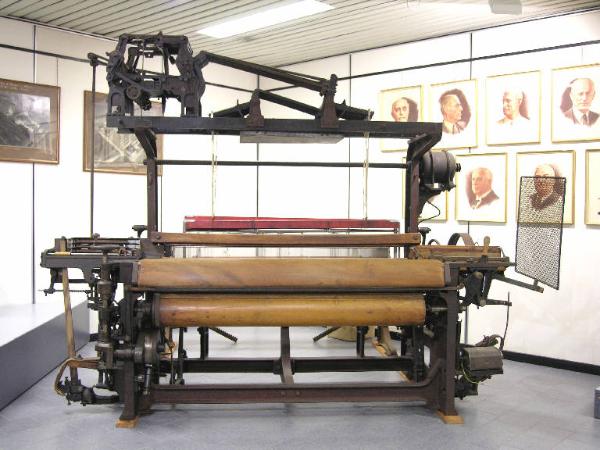 Telaio meccanico a 4x1 navette "spalla alta", con macchina ratière montata a 6 licci con maglie metalliche. Le informazioni per la realizzazione dell'armatura sono riportate su "tapparelle", tavolette di legno, forate con pioli: i fori sono disposti a righe alternate così che ogni "tapparella" comanda due trame; la sequenza delle tapparelle aggancia su due ruote dentate poste a sinistra, in alto, sulla macchina ratière, sotto le leve. I pioli delle tapparelle permettono il sollevamento delle leve della ratière (disposte in doppia serie). Il meccanismo per il cambio navetta è visibile sul fianco sinistro (quello dove sono collocate le 4 cassette sovrapposte) con una coppia di ruote dentate: una comanda i passaggi 1-2 e 3-4, l'altro il solo passaggio 1-3; per spostamenti diversi lavorano entrambe, in sequenza. Funzionamento con motore elettrico. Su tutte le parti del telaio compare punzonato il numero di matricola: "1908".