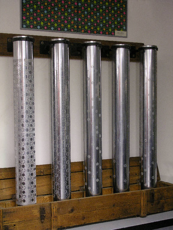 Cilindro da stampa realizzato in ferro, spessore circa cm2, con superficie cromata e incisa con retinature diverse. Vicino al margine incisione: "1422 - 4", ciè il numero del disegno e il numero d'ordine del cilindro. Disegno "KAPPAESSE CAMAIEUX" a 5 colori, (4 + 1 fondo).