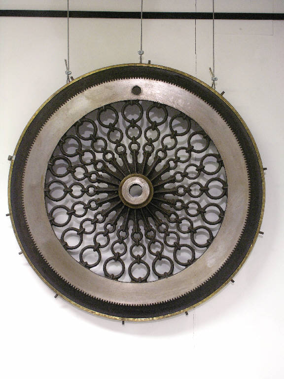 L'oggetto è una ruota dentata originariamente collocata alla testata del cilindro di un orditoio orizzontale. I raggi sono decorati con motivo a file di cerchi con diametro decrescente verso il centro.