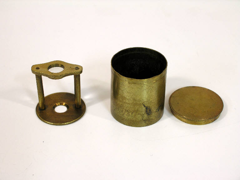 L'oggetto è costituito da una scatolina cilindrica, con coperchio, che contiene un lentino. Questo è costituito da una struttura con una lente in alto e una piasta di base con fenestratura centrale, per il posizionamento di una porzione (con area nota) del campione (di tessuto) da osservare