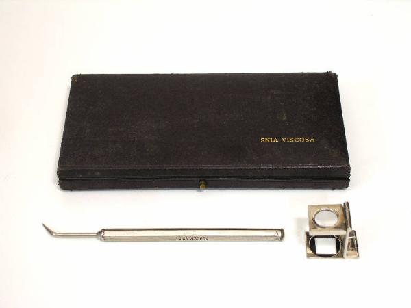 L'oggetto è costituito da una scatola foderata di tessuto contenente una serie (incompleta) di strumenti da scampionatura: 1 ago scampionatore a punta curva e 1 lentino pieghevole. Mancano: 1 paio di forbicine appuntite e 1 ago scampionatore a punta rettilinea (per i quali sono chiaramente riconoscibili le sedi all'interno della custodia). Gli accessori presenti portano inciso: "SNIA VISCOSA" e la stessa dicitura compare anche sul coperchio della scatola in basso a destra e all'interno del coperchio nella stessa posizione.