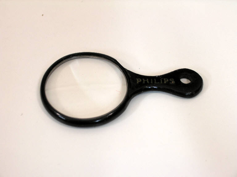 Lo strumento è una lente circolare, montata entro una cornice con breve manico, sul quale compare, inciso, "PHILIPS"