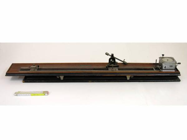 L'apparecchio completo è costituito dal torcimetro e dall'elongometro. Torcimetro: è costituito da una tavola di legno con al centro una sorta di stretto cuscino rivestito di panno nero; la tavola scorre lateralmente nei due sensi sopra apposite guide, fissate ad una seconda tavola sottostante (ciò permette all'operatore di esaminare il filo in qualsiasi punto, senza spostarsi dalla normale posizione di osservazione). Una piastra di ottone scorrevole fra una coppia di rotaie parallele porta un serrafilo a vite, una lancetta che indica su una delle due scale, che è graduata, e un fermo sempre a vite per bloccare la posizione del serrafilo. La scala graduata è lunga 1 metro, con numerazione ogni 10 unità da sinistra a destra e con numerazione da 9 a 1 (da sin. a destra) fra due decine consecutive. All'estremità destra dello strumento il meccanismo della detorsione, racchiuso in una scatola di ottone, dalla quale emerge da un lato il secondo serrafilo, dall'altro una manovellina per il suo azionamento. Un quadrante permette la lettura diretta del numero di giri di torsione. Vi sono tracciati due cerchi concentrici: su quello esterno si contano le unità fino a 100 giri, su quello internole centinaia fino a 5000 giri; rispettivamente la sfera grande segna le unità, la piccola le centinaia e le migliaia. Un bottone di scatto, situato nella parte superiore della scatola, rimette istantaneamente a zero gli indici del quadrante, ed una leva di comando posta lateralmente, quando venga messa in corrispondenza delle parole "tòrto" o "filato", permette di invertire il senso di rotazione del serrafilo, pur mantenendo alla manovella una rotazione costante nel senso della freccia. Elongometro: è costituito da un braccio a bilancere con un peso scorrevole, che permette di variare la tensione da 0 a 2 grammi; il movimento verticale del bilancere è opportunamente trasmesso ad un'asta orizzonate provvista di serrafilo e di una finestrella, attraverso la quale si leggono le variazioni di lunghezza sul quadrante sottostante; la tensione può essere variata a seconda del titolo e della lunghezza del filo, assicurando in tal modo la costanza della tensione stessa durante l'intera operazione. L'elongometro è fissato ad una piastra scorrevole fra le due rotaie, dotata di una lancetta che indica sulla scala graduata e di un fermo a vite per il fissaggio in posizione.