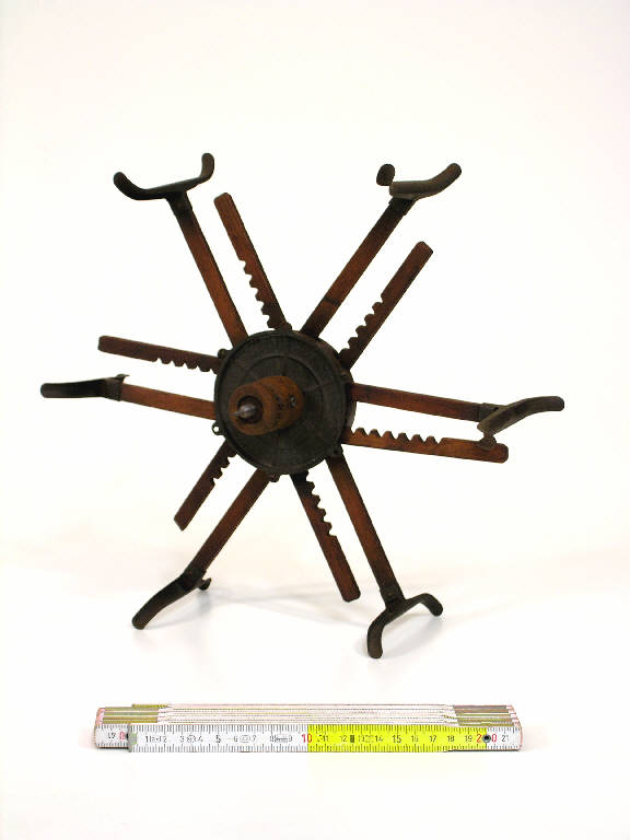 Aspino a 6 raggi regolabili in legno. Ciascun braccio termina con un supporto in ferro a forma di sella per la matassa. I bracci sono dentellati e passanti entro un meccanismo centrale in metallo la cui rotazione permette l'allungamento contemporaneo di tutti i raggi: i denti dei bracci infatti ingranano in quelli di una ruota centrale nascosta nel meccanismo.
