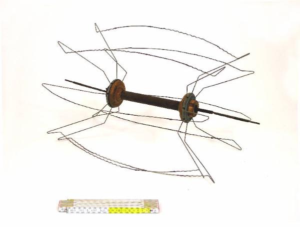 Aspino abbattibile a 8 raggi in filo metallico. 8 archi sagomati sono imperniati su una coppia di dischi con meccanismo che, se ruotato, permette l'abbattimento dell'aspino. Un lungo perno metallico centrale permette l'appoggio dell'oggetto sul suo supporto.