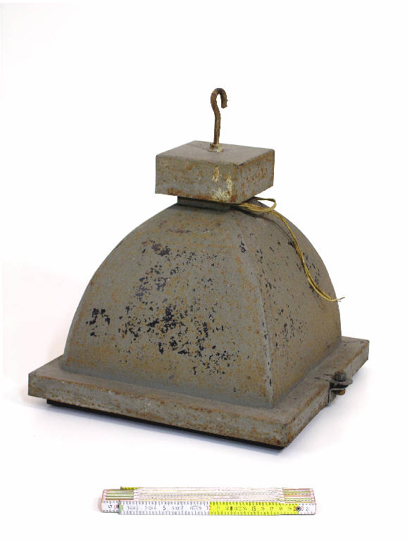 Lampada con ampio portalampada in lamiera. Sulla faccia inferiore un vetro crosso filtra la luce prodotta dalla lampada ad incandescenza