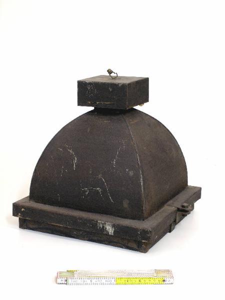 Lampada con ampio portalampada in lamiera. Sulla faccia inferiore un vetro crosso filtra la luce prodotta dalla lampada ad incandescenza