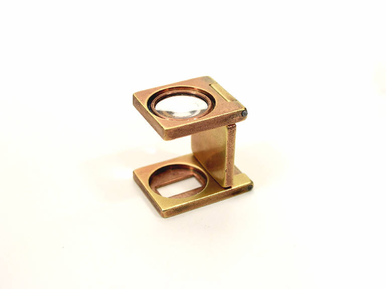 Lo strumento è una lente pieghevole, formata da tre piastre incernierate: la piastra che fa da base possiede una fenestratura di cm 1x0,5 con la funzione di delimitare una porzione di campione di area nota; quella verticale ha la funzione di distanziare correttamente campione e lente; quella superiore porta la lente circolare. L'oggetto è il classico lentino da scampionatura utilizzato nel settore tessile. Ingrandimenti ?