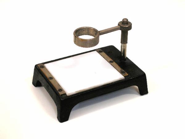 L'accessorio è costituito da una base robusta con un piano in vetro bianco. Un braccio porta un supporto cilindrico per l'alloggiamento, probabilmente, di un lentino da osservazione
