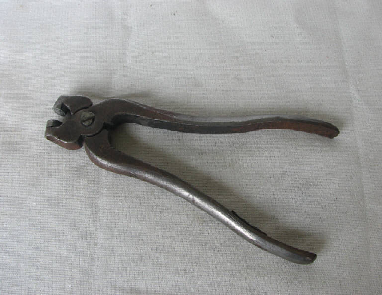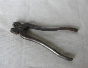 punzone a pinza con impugnatura in acciaio con matrice riportante la sigla FNM da una parte e STB ( stamperia biglietti ) dall'altra