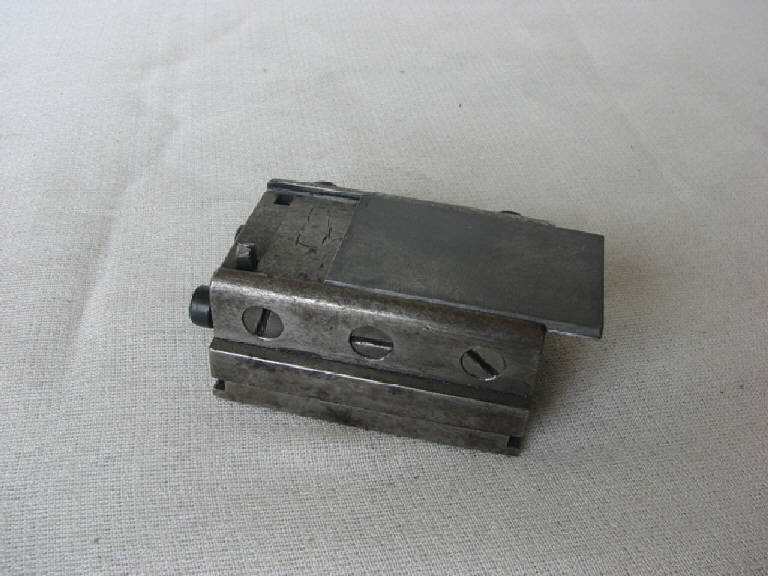 supporto semplice in acciaio con viterie di montaggio su macchina stampatrice a forma di parallelepipedo con faccia superiore dotata di incastro a slitta per l'inserimento di matrice completa
