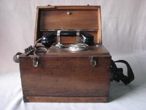 scatolato in legno con coperchio bloccato con due fermagli a ribaltamento.Sul lato destro una manovella girevole.Una cinghia puntata alle estremità per il trasporto a tracolla.\nSollevato il coperchio sul piano superiore è installato il disco combinatore,una lampada spia e due ganci per sorreggere la cornetta.All'interno un magnete permanente,una bobina di induzione, la suoneria,le batterie, il microtelefono.