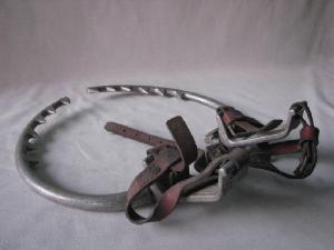 staffa a C con parte concava dentata.Ad una estremità pedalina per scarpe speciali antinfortunistica e cinghie in cuoio per legacci