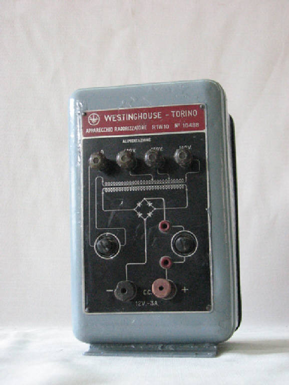 parallelepipedo in lamiera con superfici laterali ,superiore ed inferiore forate per passaggio aria.Sulla superficie frontale in alto n° 4 morsetti di alimentazione con taratura per 0,140,150 ,160 volt ; u disegno dello schema delle apparecchiature interne formate da un trasformatore e da un raddrizzatore a ponte di Graetz; in fondo la presa di uscita a 12 volt ,3 ampere