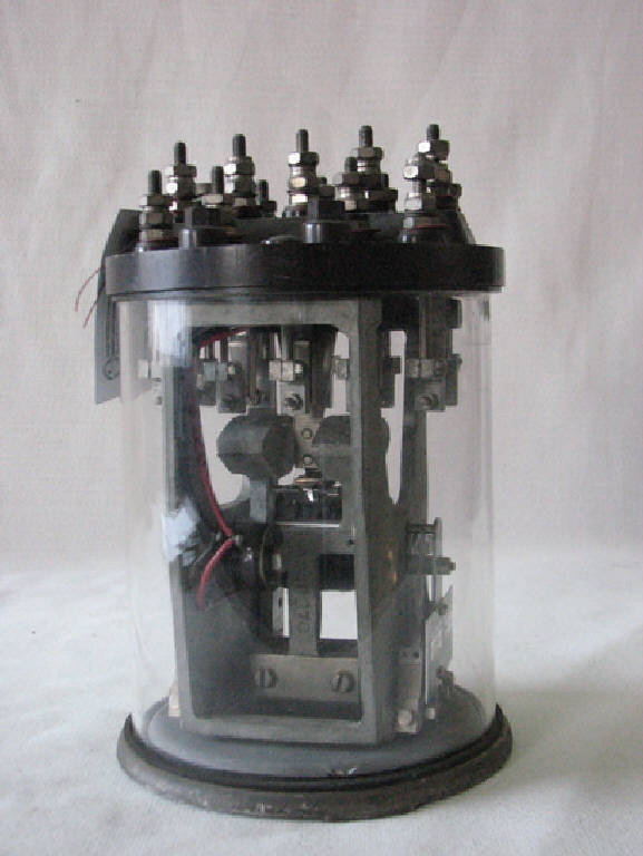 cilindro in vetro con basamento e coperchio in metallo,Serie di morsetti elettrici sul coperchio con estremità all'interno dove è fissata una grossa bobina con contatti elettrici.