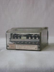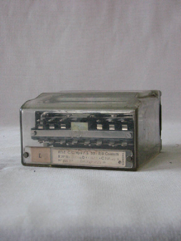 scatola in plexiglass trasparente con basamento metallico al cui interno è fissata l'apparecchiatura di un relè elettomagmetico con bobina e contatti elettrici