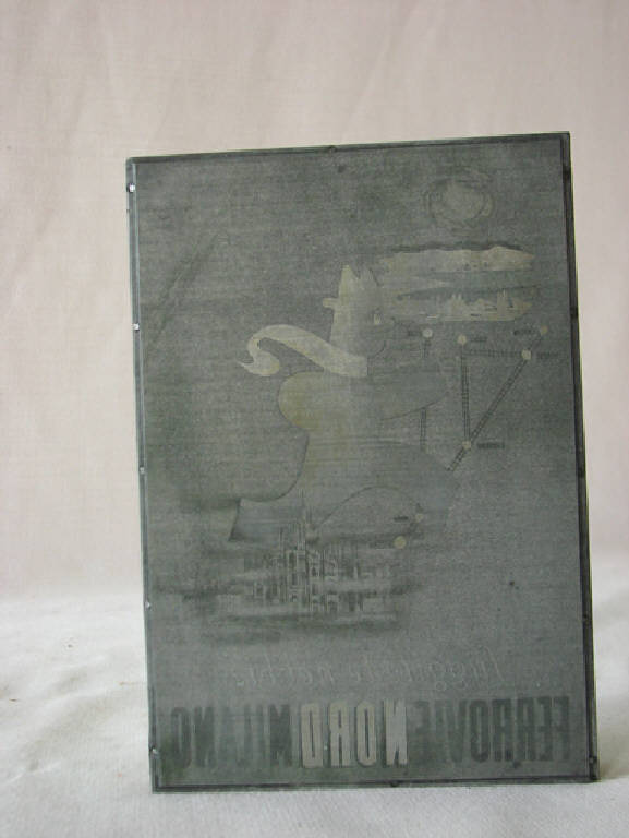 lastra per manifesto pubblicitario per posti di villeggiatura : Pupazzo con gli sci e campi di sci con lo sfondo il duomo di Milano e lo schema della rete ferroviaria