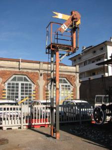 profilato metallico verticale ancorato a terra su cui poggia fissata una scaletta metallica terminante con un terrazzino per gli operai che vi devono operare.In alto,incernierata al traliccio ,un'ala metallica rettangolare a mò di bandiera con l'estremità incernierata leggermente più grande ,con due oblò rotondi con vetro rosso superiore e con vetro verde più basso.L'ala ha fondo rosso con un rettangolo bianco verso l'estremità sporgente.Sul bianco c'è un 2 nero che indica che il segnale è di 2° categoria.Dietro questa c'è un'altra ala color giallo con rettangolo bianco terminante a coda di rondine.\n Alle ali sono fissati dei fili metallici che passando per alcune carrucole vengono giù paralleli al traliccio finendo dentro carrucole e collegati con la stazione.Dietro l'oblò superiore color rosso c'è una lampada a petrolio permanentemente accesa che illumina il segnale.Una piastra metallica legata al filo di ferro sotto l'ala funge da contrappeso.