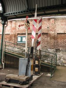 la cassa di manovra era costituita da un parallelepipedo con il lato lungo verticale ancorato su piccolo piedistallo in cemento.All'interno una carrucola comandata a filo metallico faceva girare un tubo metallico con un grosso contrappeso nella parte bassa mentre la parte alta usciva dalla cassa e nel vano cavo del tubo veniva infilata l'asta a strisce bianche e rosse della lunghezza della carreggiata della strada.Dalla cassa usciva anche un tubo terminante in alto con una cupoletta a campana ed una girandola.Al'interno c'era una campana a battimento.