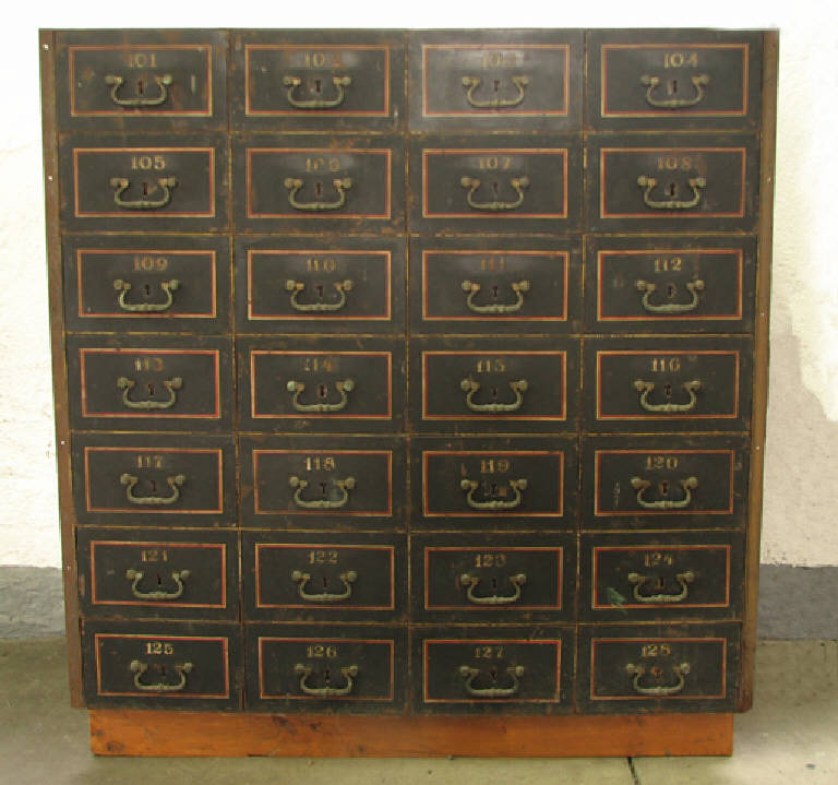 parallelepipedo d'acciaio con frontale aperto in cui sono ricavate le sedi per infilare cassette di sicurezza : n° 4 file orizzontali di n° 7 cassette ciascuna Per un totale di 28 cassette.Ogni cassetta ha la serratura per una chiave a mappa tradizionale ed una maniglia.Le cassette sono numerate da 101 a 128