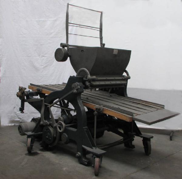 telaio unico con barre d'acciaio a forme curvilinee poggiante su 4 piedi con ruote pivottanti su cui è montata per tutta la larghezza e lunghezza un ripiano orizzontale in lamiera su cui scorrono due catene che girano anche al di sotto del ripiano.Sopra questo, a cavallo nella parte centrale, è montata una tramoggia che termina restringendosi e sotto cui si aprono n°8 ugelli terminanti con un beccuccio cilindrico.La tramoggia è coperta da un coperchio in lamiera , con contrappeso , manovrabile manualmente.Sopra le catene del ripiano sono poggiati dei vassoi a lamiera piana che vengono fatti avanzare con il movimento delle catene,passando sotto gli ugelli.\nSotto il telaio è montato un motorino elettrico con un albero di uscita che attraversa trsversalmente la macchina e per mezzo di ingranaggi, leve ed altri alberini comanda il movimento delle catene ed il movimento di una lamina che apre e chiude le aperture degli ugelli.\n\ncaratteristiche del motorino. Kw 0,75 ; G/ m 930 , HZ 50 ; volt 380/220