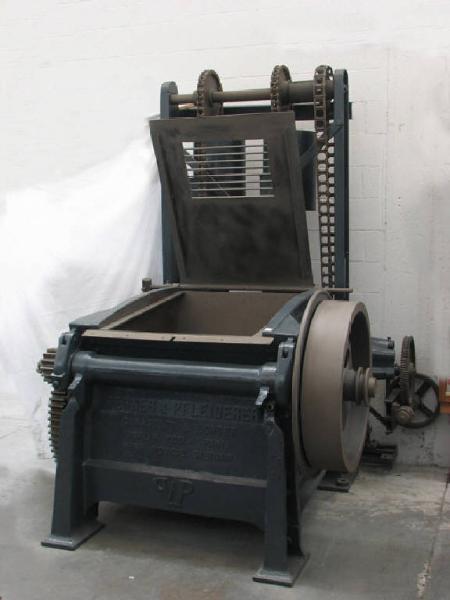 la macchina è composta da un pesante telaio metallico, chiuso su 3 lati ,poggiante su due grosse nervature anteriori facenti un tutt'uno con la facciata e due montanti posteriori più snelli ma più alti.\nAll'interno un cassonetto metallico a forma cubica , aperto superiomente ma chiudibile con coperchio manovrabile da manovella e contrappeso ; il bordo anteriore-superiore è incernierato su un asse orizzontale , potendo ruotare attorno allo stesso .Il fondo interno del cassonetto è composto da due corpi semicilindrici all'interno dei quali possono ruotare due specie di pale a forma di Z allungata.I due montanti posteriori del telaio sono collegati da un albero orizzontale su cui sono calettate 3 ruote a carrucola attorno alle quali ruotano delle catene ad una cui estremità sono collegati contrappesi cilindrici pieni in ghisa.L'altra estremità di due è collegata al bordo inferiore-posteriore del cassonetto azionate da un motorino elettrico mentre la terza è collegata alla manovra del coperchio. \nUn albero orizzontale, inserito sul bordo superiore della facciata , ha calettata sulla destra un grande ruota liscia sede di collegamento di una cinghia di trasmissione che riceve il moto da un sistema centralizzato,L'altra estremità dell'albero trasmette il movimento mediante ingranaggi agli alberi delle pale a z ruotanti dentro i due corpi semicilindrici del cassonetto.
