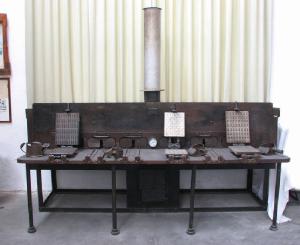 è costituito da un bancale sorretto sul davanti da 4 aste con piede di appoggio e sul retro da una gabbia di trafilati a forma di parallelepipedo con il lato lungo pari a tutta la larghezza del forno ed il lato corto pari a metà della profondità.Su questa parte è appoggiato il corpo del forno costituito da un parallelepipedo chiuso con n° 6 portellini davanti ad ognuno dei quali c'è un binario su cui scorre uno stampo a libro.Sotto al centro c'è la camera del fuoco con due portelli anteriori : quello di sopra per l'introduzione del combustibile a carbone e quello di sotto per il deposito della cenere ; in corrispondenza al di sopra esce il fumaiolo.Sui due fianchi del corpo del forno degli sportellini per l'aerazione ( n° 2 per lato).\nsulla parte bassa del frontale al centro ,tra le bocche dei portelli, il pirometro con cui si misurava la temperatura della camera di cottura era del tipo a grafite della Ditta OMS di Torino,con scala da 0 a 500 gradi centigradi: n° matricola 21620
